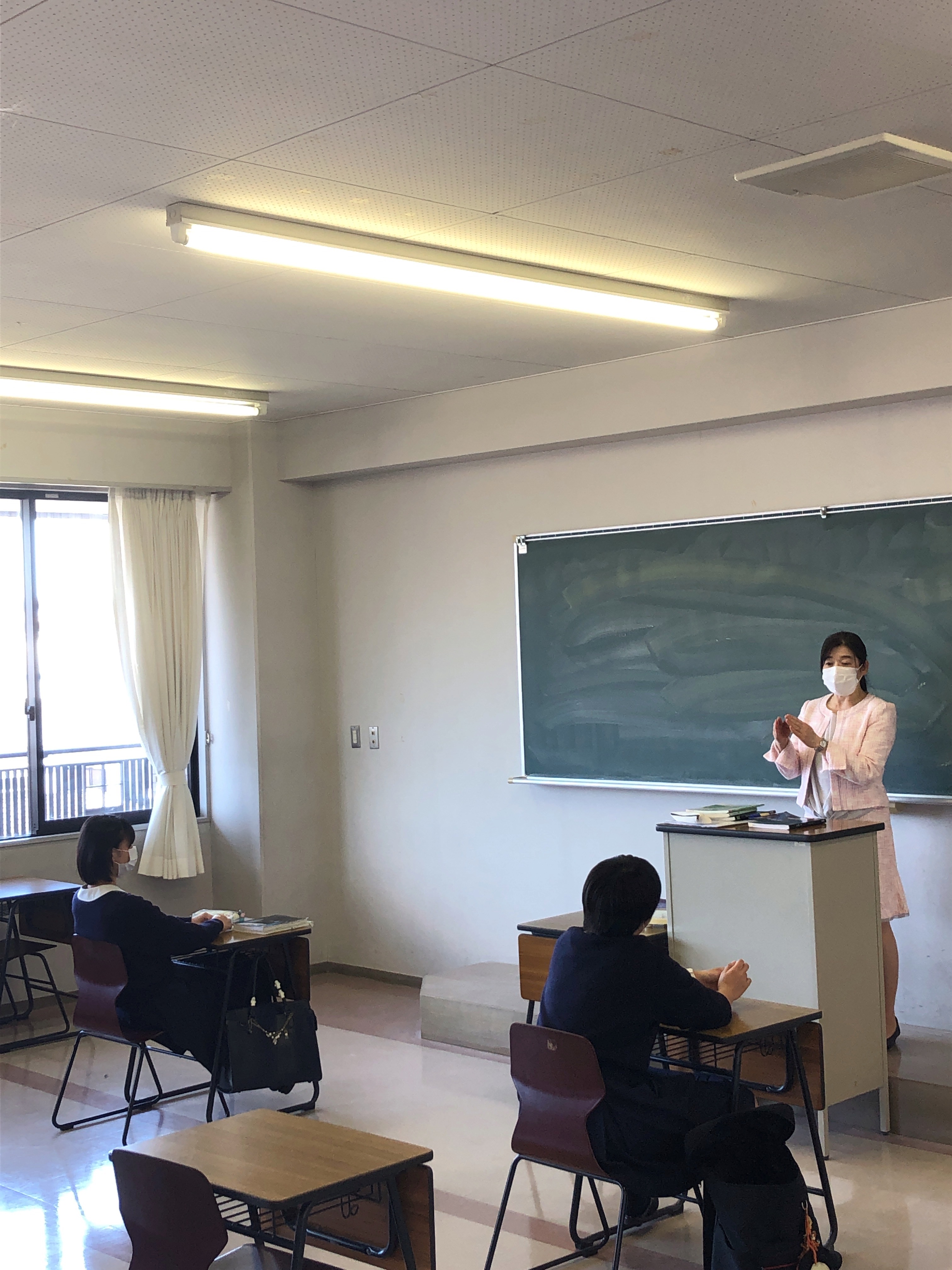 感染予防の観点から机の間隔を広く取り、教員はマスクもしくはフェイスシールドを着用しています。