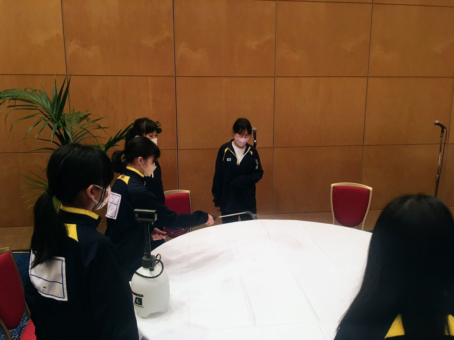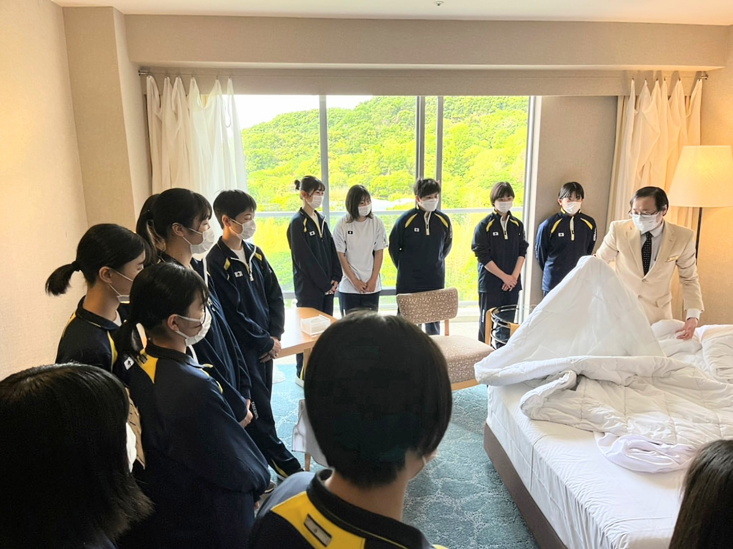 宿泊研修2日目は、午前中に、ホテルでの職業体験としてテーブルセッティングやベッドメイキング等を体験しました。