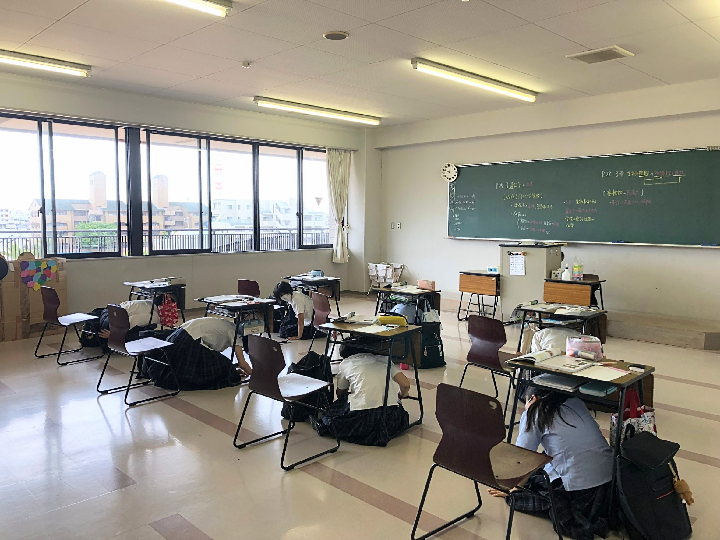 6月15日(水)、「緊急地震速報訓練」が全国一斉に実施されるのに合わせて、西宮市では南海トラフ巨大地震に備えた訓練が行われ、本校もシェイクアウト訓練(安全確保行動)に参加しました。