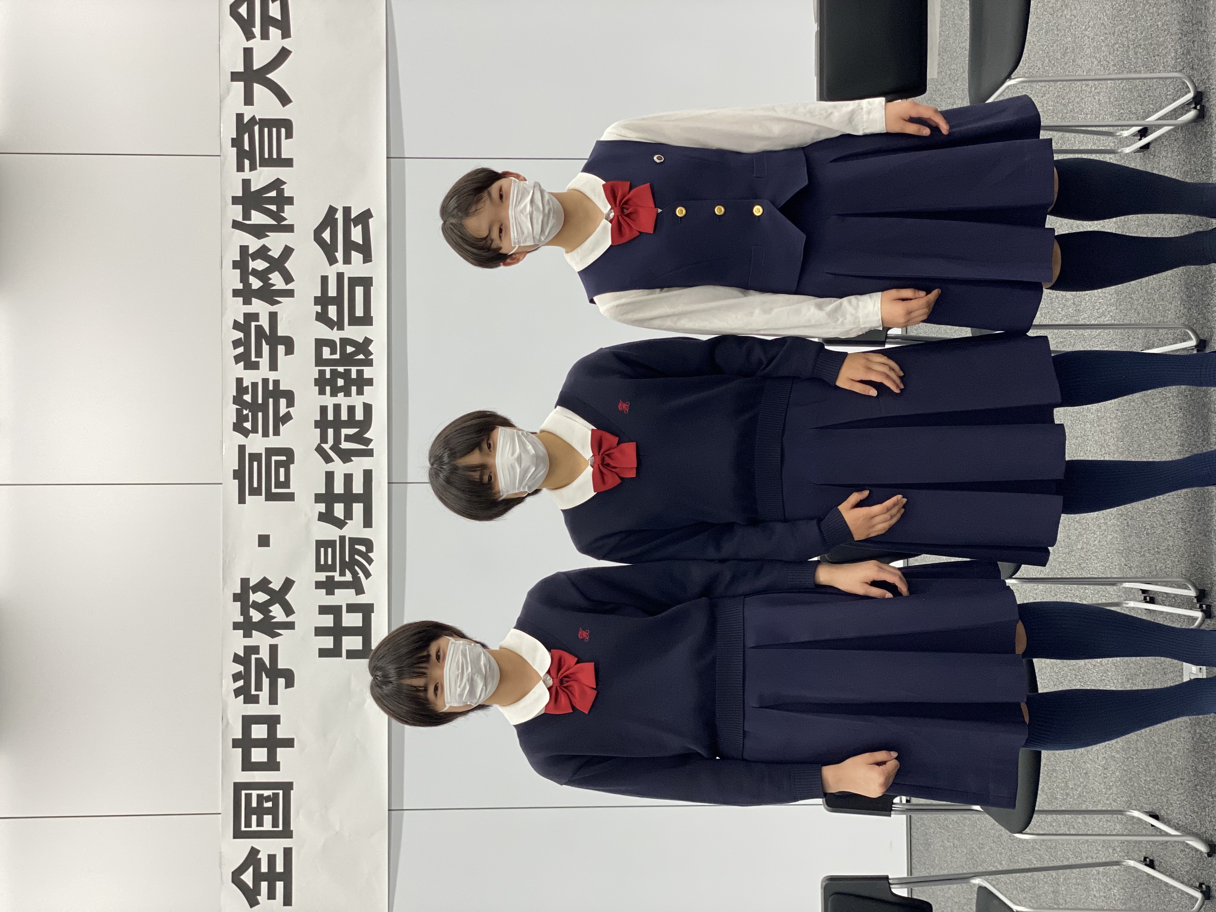 10月7日(金)、西宮市役所にて令和4年度 全国中学校体育大会および全国高等学校総合体育大会出場生徒報告会が行われ、本校から全国大会に出場したメンバーを代表して、白川茉奈さん(剣道部:中3)、有島彩さん(バレーボール部:中3)、大島彩愛さん(バレーボール部:中3)の3名が出席しました。