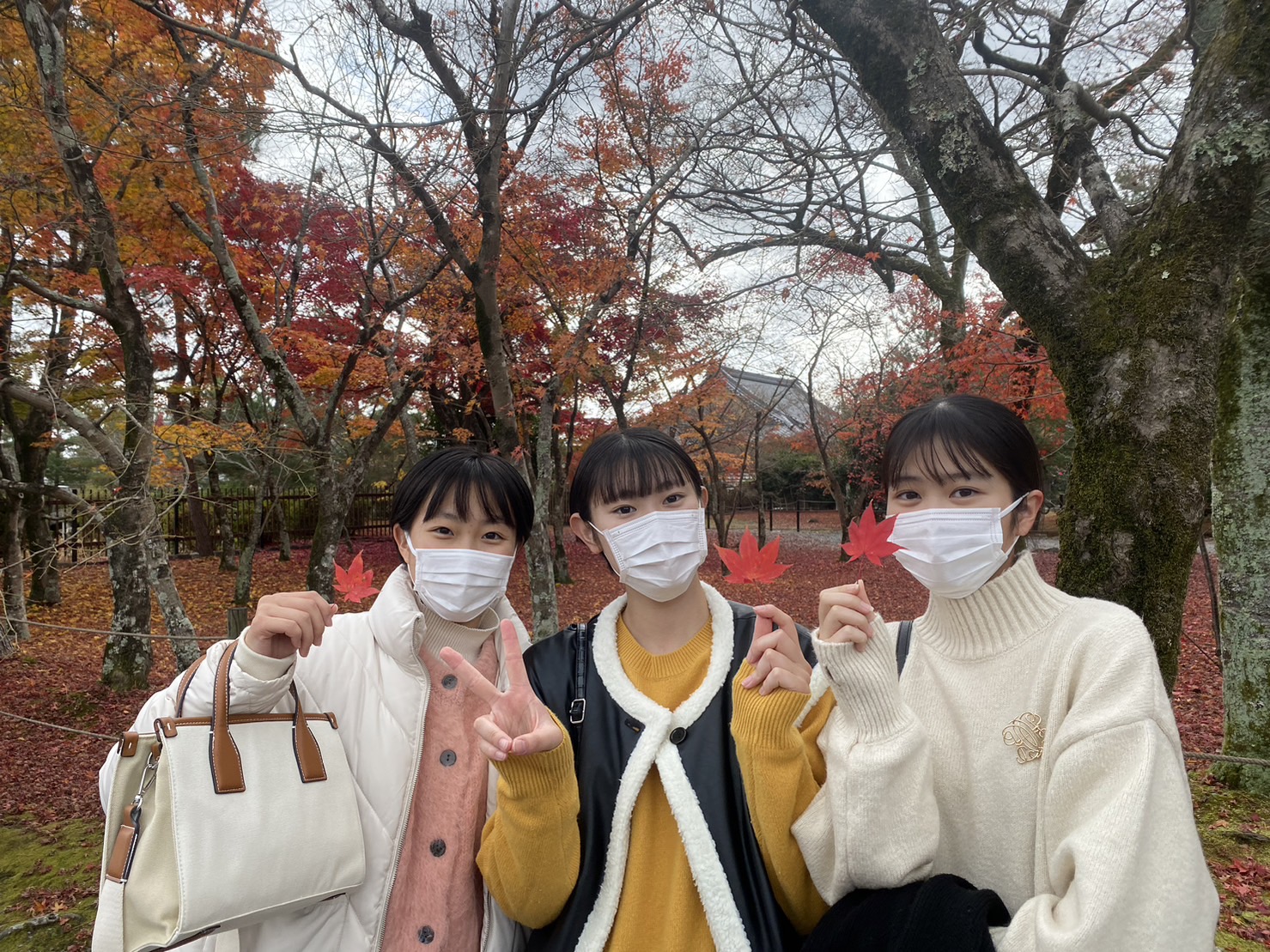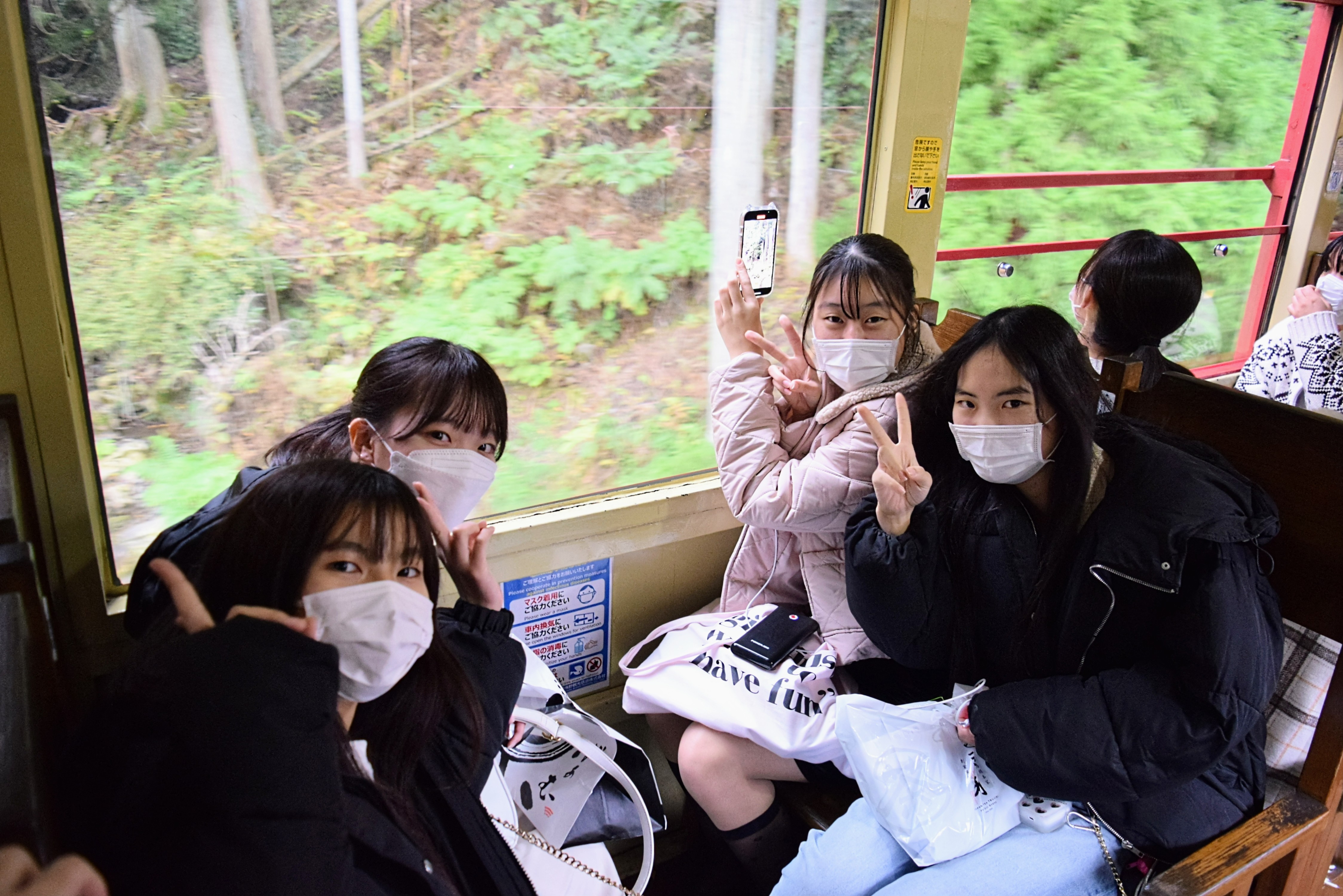 2年生は、嵐山公園でクラスごとに写真を撮り、世界遺産である天龍寺を拝観したり、トロッコ列車に乗って亀岡地区を散策したりしました。