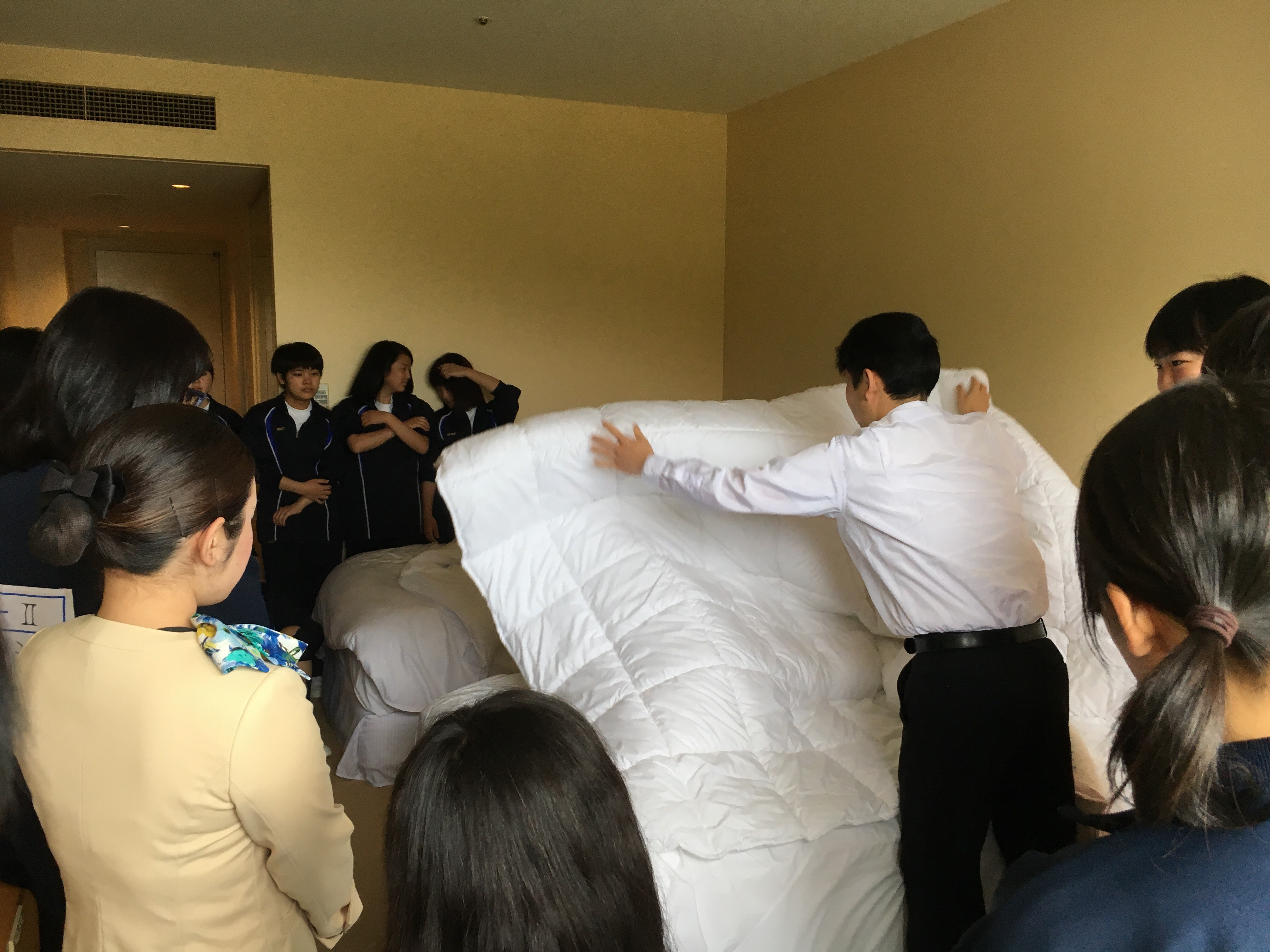宿泊研修2日目は、午前中にベッドメイクとテーブルセッティングを体験しました。