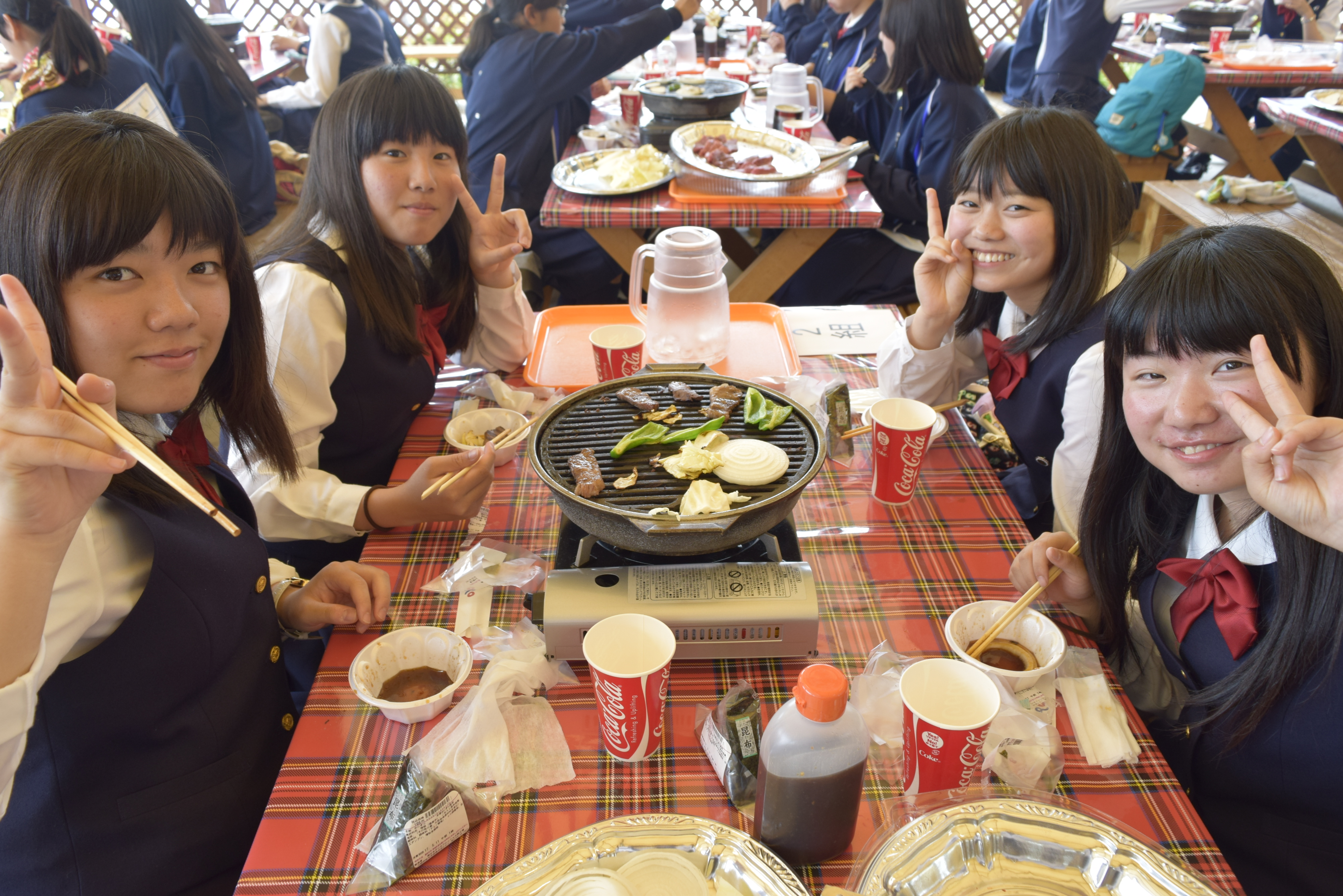 昼食はバーベキューを囲み、ボリュームも満点で、生徒たちはみな大満足でした。そして、元気に無事学校に到着しました。