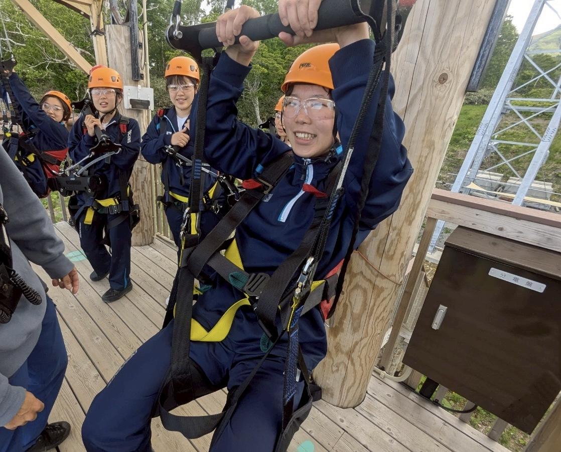 グループ別研修で高橋牧場に行った生徒たちは乳製品のスイーツを堪能し、ジップラインを体験した生徒たちは日本最長1.7kmのジップラインを滑走しました。最初は怖がっていましたが、終わった後は楽しかったという声が多かったです。