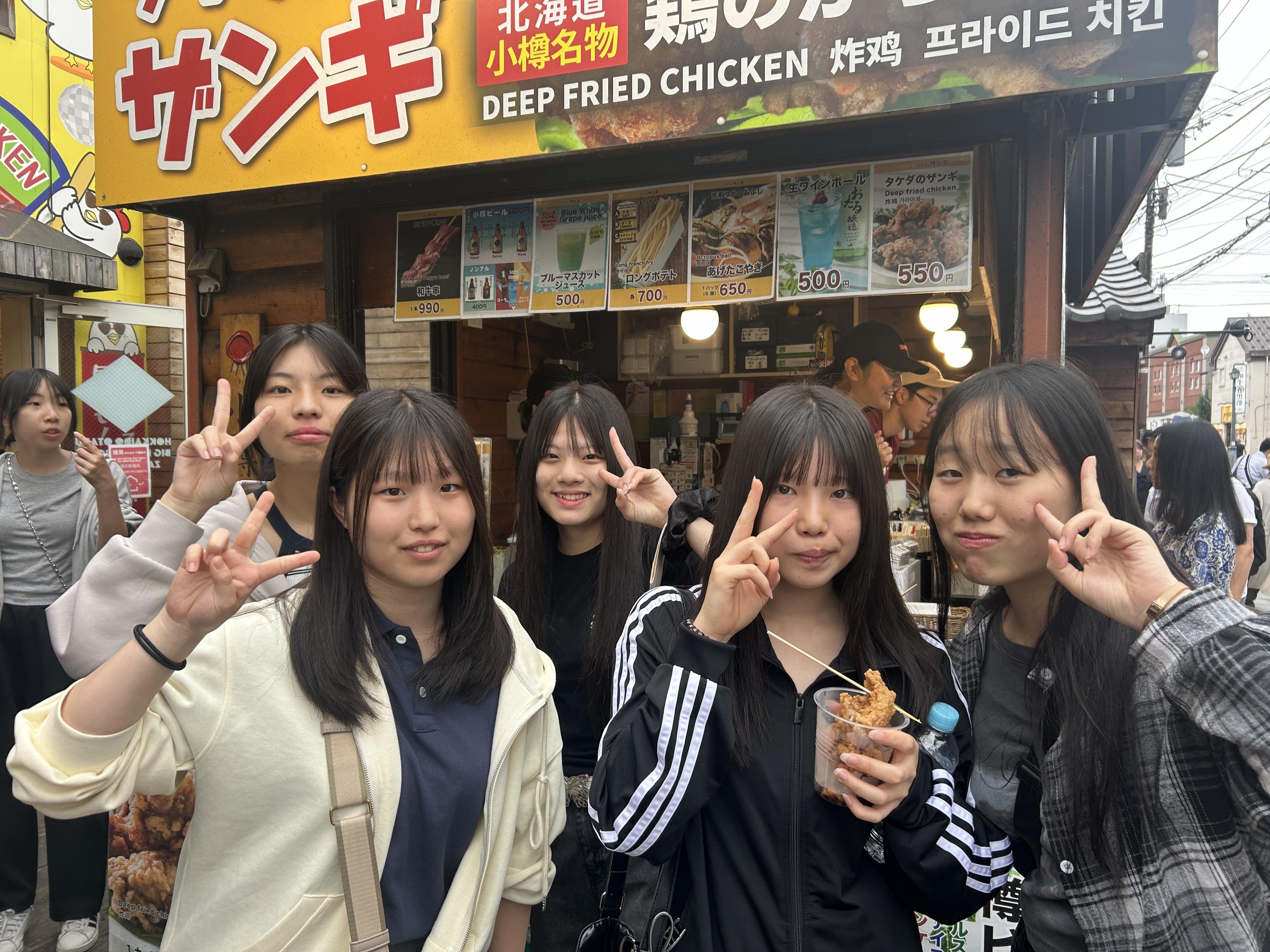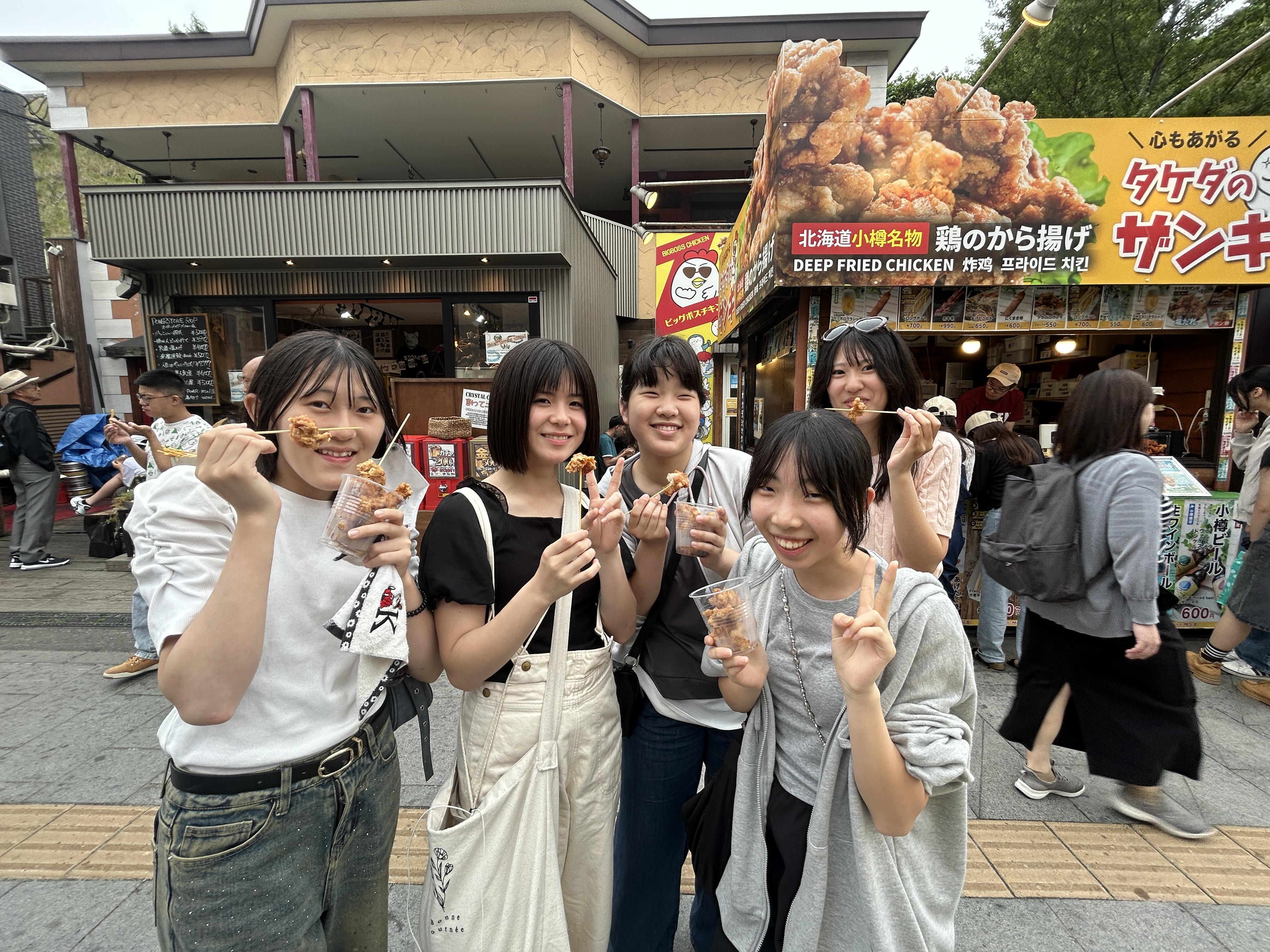 小樽運河でクラスの集合写真を撮った後、各班は小樽の街へと繰り出しました。街の雰囲気を見て楽しんでいる生徒や小樽のグルメを食べ歩いている生徒もいました。