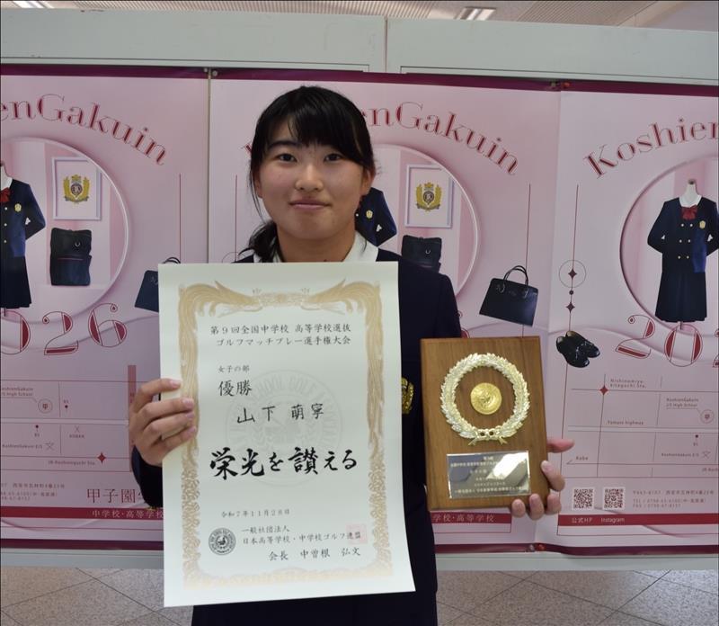 11月25日(火)~28日(金)の期間、カヌチャリゾートカヌチャゴルフコース(沖縄県名護市)で行われた「第9回全国中学校・高等学校選抜ゴルフマッチプレー選手権大会女子の部」において、本校中学校3年の山下萌寧さんが優勝しました。